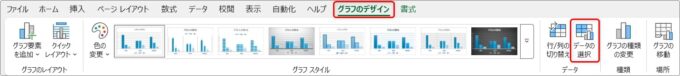 グラフを選択して、[グラフのデザイン]タブ → [データの選択]をクリック。