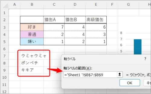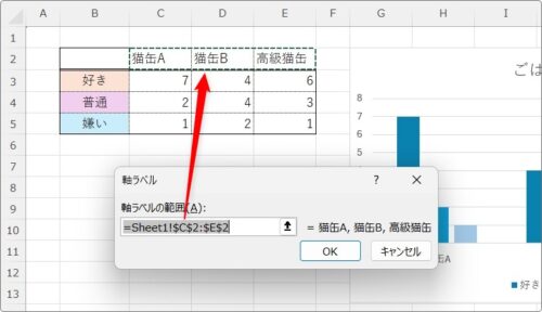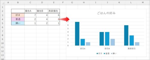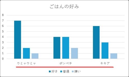 では、左の表から右のグラフを作成して、その横軸の名前を変更していきます。