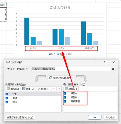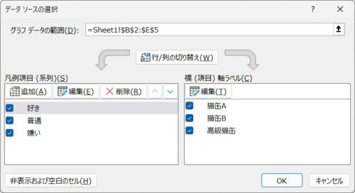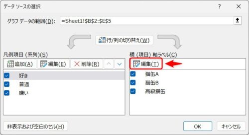 また、[データソースの選択]画面は、系列の変更など細かい指定で役立つ機能が揃っているので、全体を確認しておきたい場所ですよ。