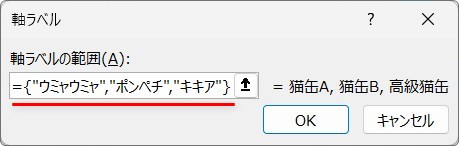 エクセルのグラフの横軸の自動で出てくるラベル名を変更する方法です。
