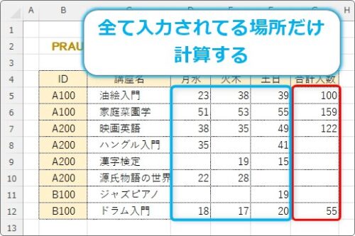 全てのセルにデータが入っている場合だけ計算する方法