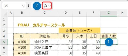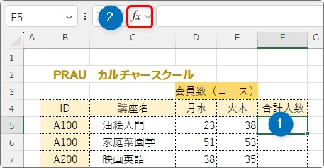 数式を入れるセルを選択して、[関数の挿入]ボタンをクリック。