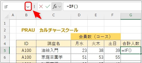 すぐにIF関数の中に、COUNT関数をネストして使いたいので左上の[名前ボックス]の右側をクリックします。