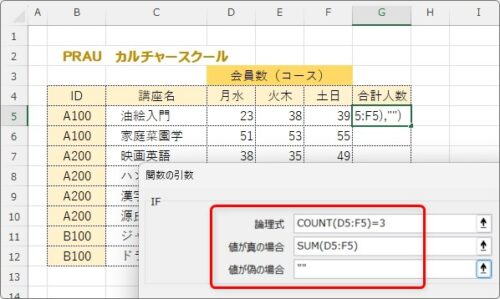 「もし、D5~F5に数値が入っているセルの数が3だったら、D5~F5の合計を出して。違う場合は空欄にして」という感じ。