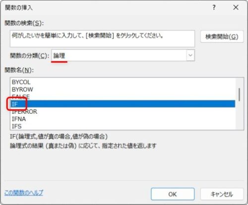 「IF」関数を選んで、