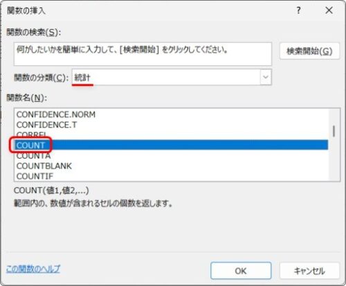 [関数の分類]を[統計]か[すべて表示]にして「COUNT関数」を選びます。