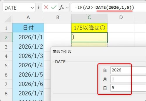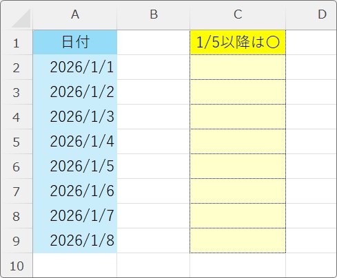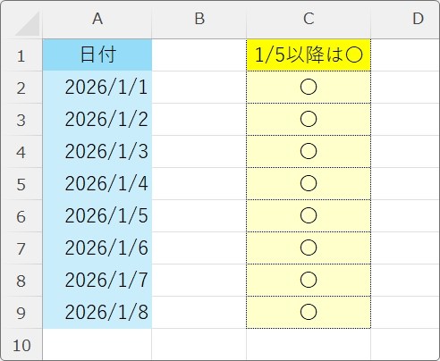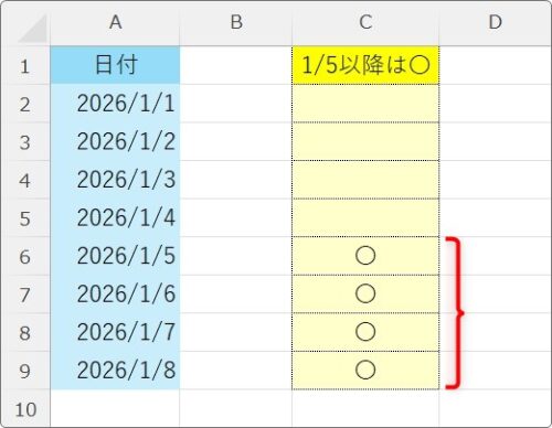 =IF(A2>=DATE(2026,1,5),"〇","")