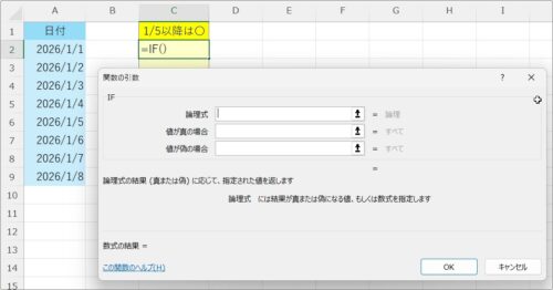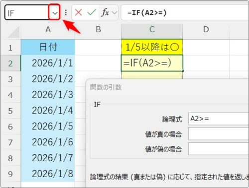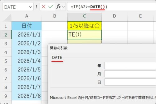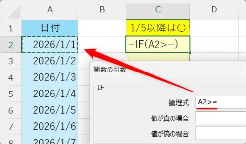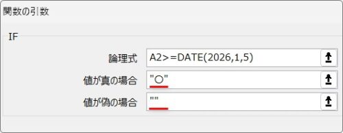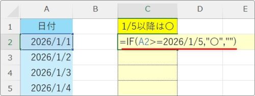 =IF(A2>=2026/1/5,”〇”,””)