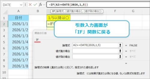 すると、「IF関数」の引数入力画面に戻ってくれます。