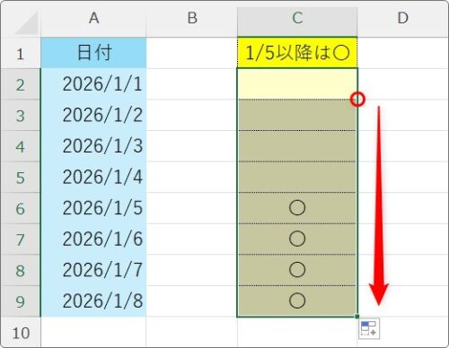 下の表で、1/5以降に「〇」を表示したかったとします。