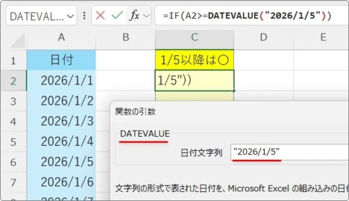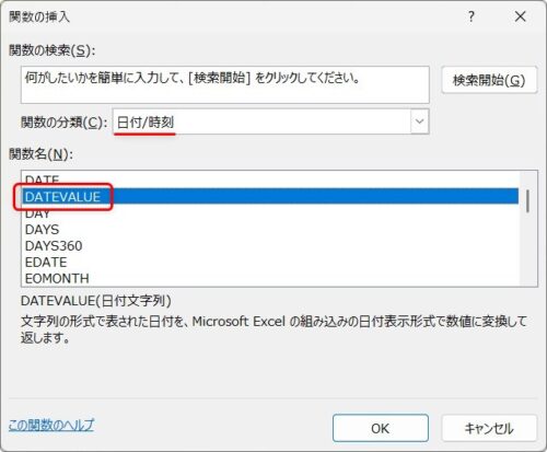 手順は全く同じで、DATE関数の場所でDATEVALUEを選びます。