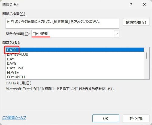 表示された画面でDATE関数を探して[OK]をクリック。
