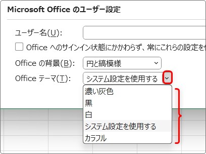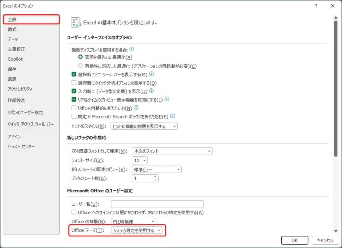 左側で[全般]を選び、右下の[Office テーマ]の場所で設定を変更します。