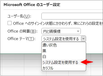 Excelの[システム設定を使用する]を選ぶと、「ライト」の場合は「白」、[ダーク]の場合は「黒」が設定されます。