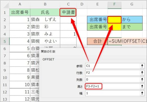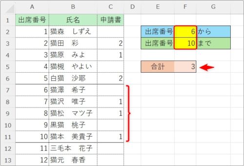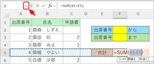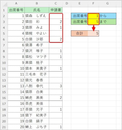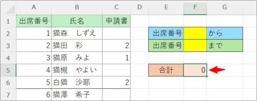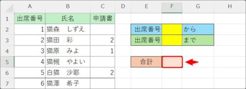 では、下のように、黄色のセルに数字を入力したら、その「出席番号」の範囲を合計するように設定してみます。