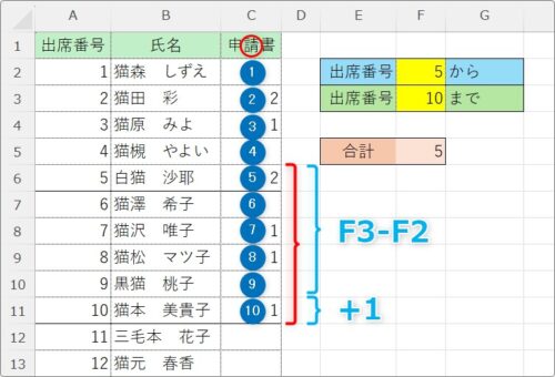 そのため、その「F3-F2」に「1」足す必要があります。