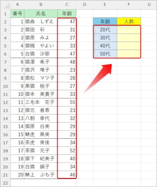 今回は下のように集計したいのですが、「20代」「30代」「40代」「50代」のセルは範囲指定としては使えません。