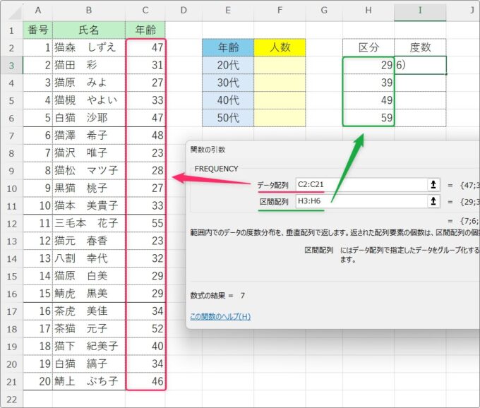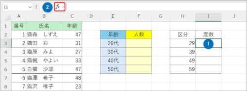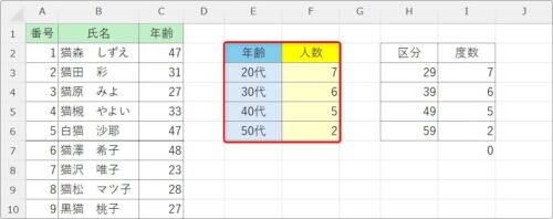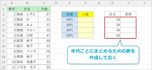 準備ができたら、その表にFREQUENCY関数を使用して年代ごとの人数を集計します。