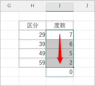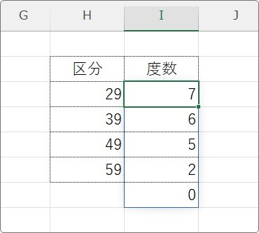「あれ?一つ余計に「0」が表示されている。」と思うかもしれませんが、最後の「0」の場所は指定した区分より大きい数値があった場合に、その個数が表示される場所なので気にしなくて大丈夫です。
