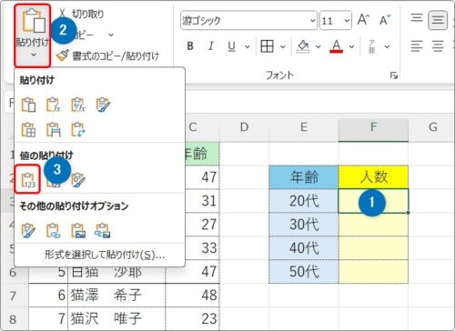 コピーしたら、貼り付ける場所を選択して[貼り付け]ボタン → [値]をクリック。