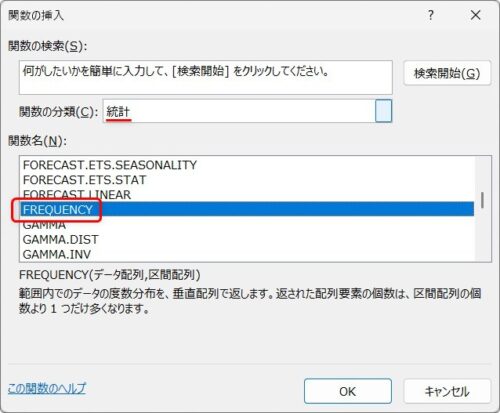 [関数の分類]を[統計]か[すべて表示]に変更して「FREQUENCY」を選んで[OK]をクリック。