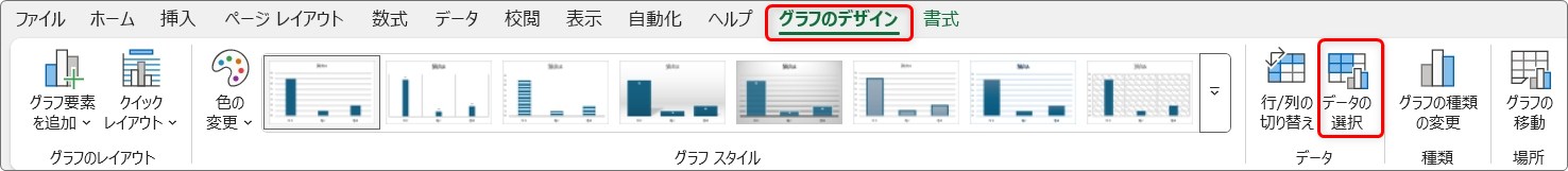 グラフが選択されている状態で、[グラフのデザイン]タブ → [データの選択]をクリック。