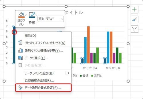 どこかの系列(棒部分)で右クリック → [データ系列の書式設定]を選びます。