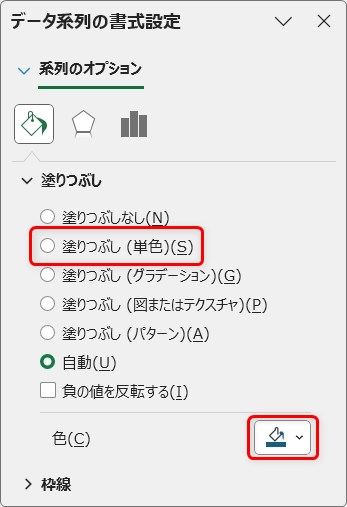 最初は[自動]が選択されていますが、[塗りつぶし(単色)]で同じジャンルの系列は同系色の色を選ぶと良いでしょう。