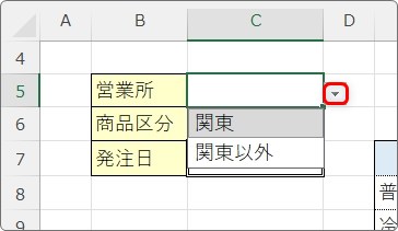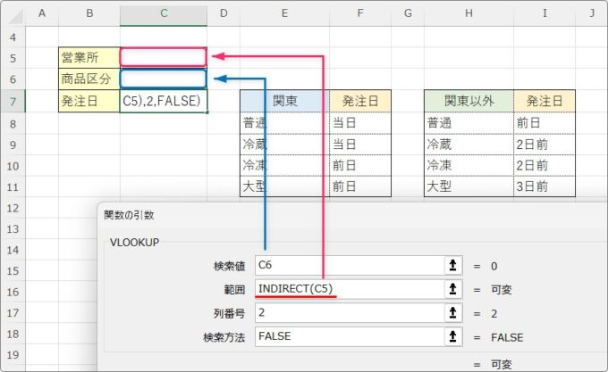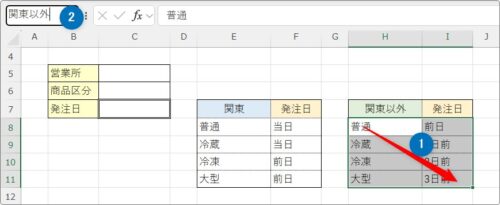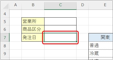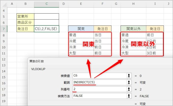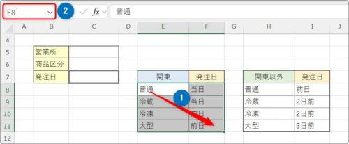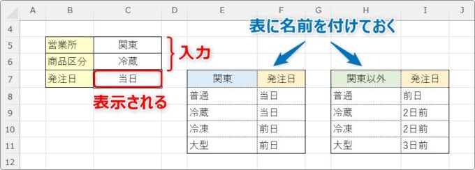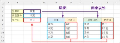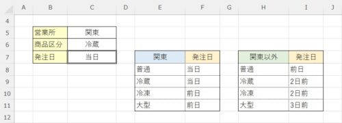 左上の「営業所」と「商品区分」を入力したら、右下2つの表を参照して「発注日」が表示されるようにします。