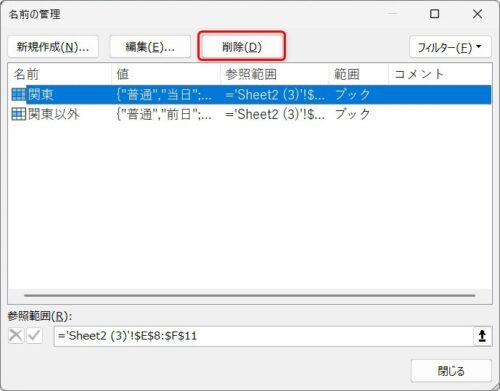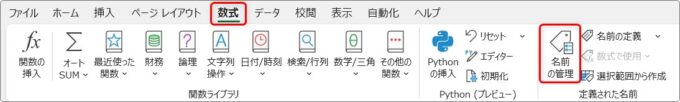 定義した名前を削除したい場合は、[数式]タブ → [名前の管理]を押して、