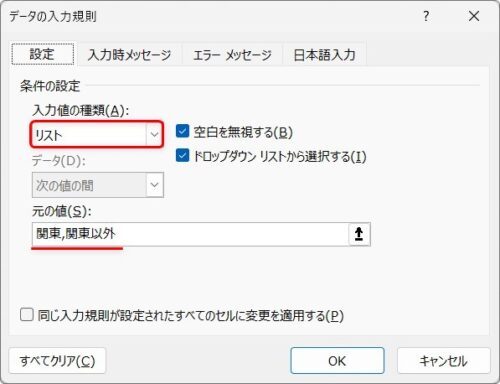 表の名前は今回は「関東」と「関東以外」と付けます。