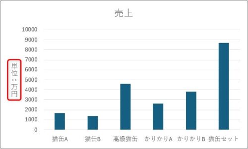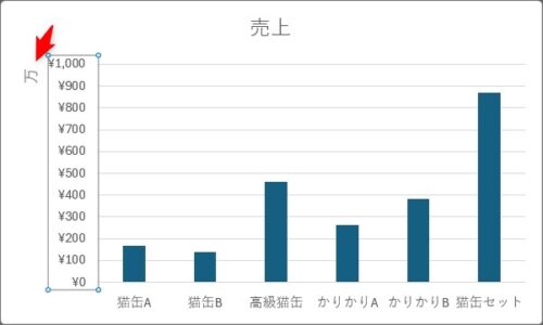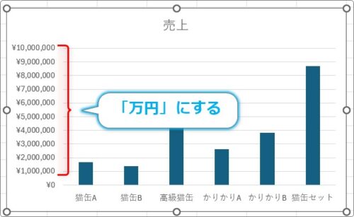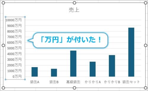 おまけで、軸の数値一つ一つに「万円」と表示する方法を紹介しておきます。