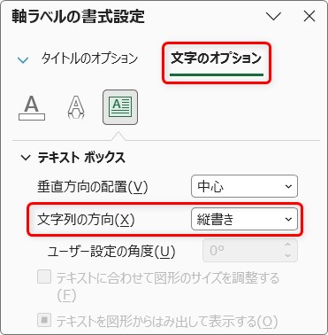 文字が横向きになっているのを縦にするには、画面右側に表示されている作業ウィンドウの[文字のオプション]を選んで、[文字列の方向]をクリックして[縦書き]を選びます。