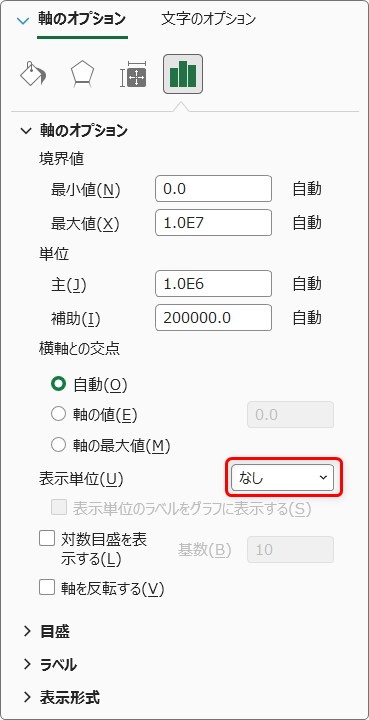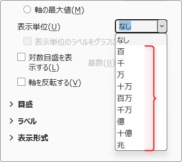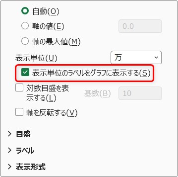 すぐ下にある[表示単位のラベルをグラフに表示する]にチェックを入れます。