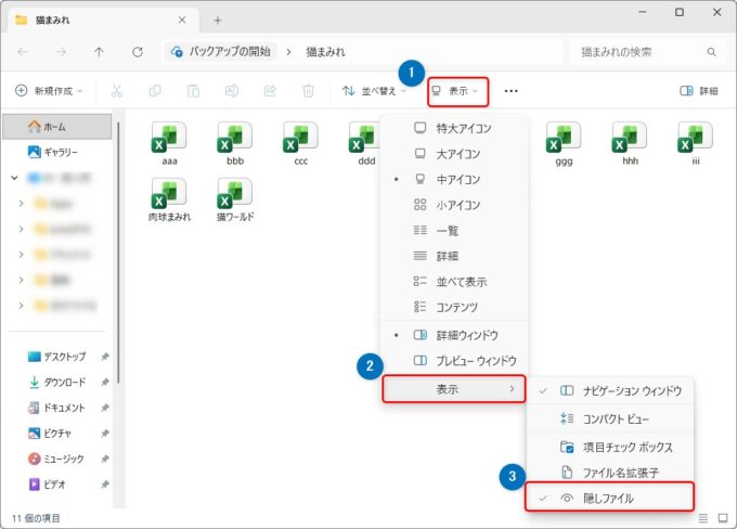隠しフォルダーや隠しファイルを表示する方法の説明です。